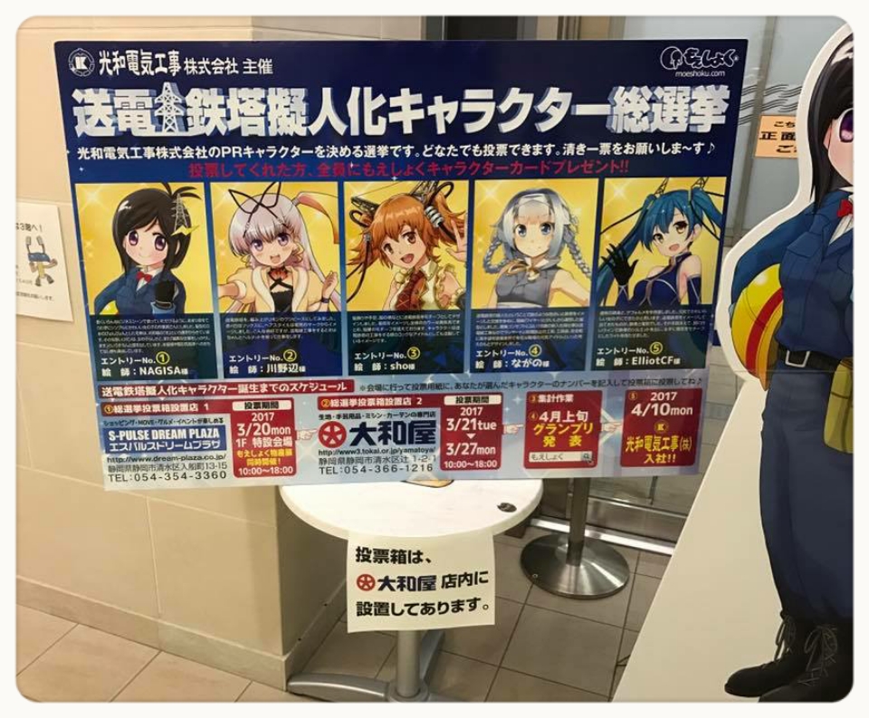 只今、大和屋(JR清水駅西口より徒歩2分 えじりあ1F)3月21日~27日迄)にて投票を行ってます。是非お越しください!! 3月21日(火)~27日(月):大和屋(投票場所:店内、パネル設置場所:えじりあエレベーター前)内での様子 シェアする